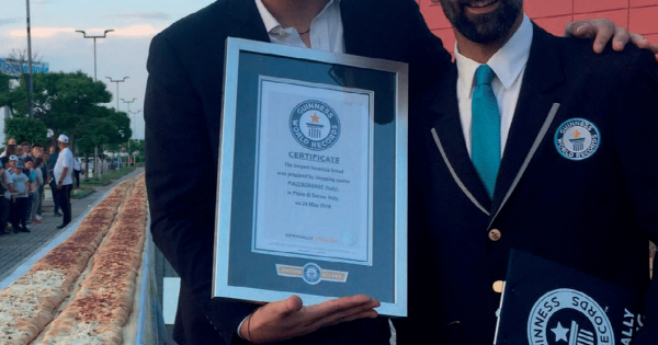Il centro commerciale Piazzagrande, che festeggia quest’anno i 25 anni di attività, entra per la quinta volta nel Guinness World Record, questa volta con la focaccia più lunga del mondo. In passato si era già aggiudicato i primati per lo spritz Aperol più grande, la fila di panini più lunga, la barretta di cioccolata e il Tiramisù più grandi del mondo. Chi vorrà strapparle il primato ora dovrà superare i 169,27 metri sfornati, senza soluzione di continuità, sul lunghissimo tavolo predisposto nel piazzale del centro commerciale. Il precedente record (121 metri) era stato stabilito lo scorso anno a Montevarchi. Una vera e propria impresa, terminata in serata dopo quasi diciotto ore interrotte di lavoro. Si è iniziato a predisporre l’impasto, ottenuto grazie agli oltre 15 quintali di farina messi a disposizione da Molino Rossetto di Pontelongo, già dalle prime ore della mattinata, mentre il forno mobile “a tunnel” ha iniziato a lavorare senza sosta dalle 11. E’ stata proprio la cottura la fase più delicata, con il forno, caricato su un carrello, che è stato fatto avanzare a mano ogni tre minuti, il tempo necessario per cuocere un metro di focaccia. A tutte le operazioni ha partecipato in prima persona il direttore Filippo Lazzarin che ha diretto come un’orchestra la quarantina di volontari che, sotto un sole a tratti cocente, sono stati coinvolti nell’impresa. Il maestro pizzaiolo Loris Sartore si è occupato dell’impasto e della variegata farcitura. Alla fine ne è uscita una “focacciona” a forma di ferro di cavallo, uniforme, saporita e colorata, larga 20 centimetri e alta 3 centimetri, come richiesto dal protocollo. Quando il giudice ufficiale Lorenzo Veltri, inviato direttamente da Londra e noto ai più per essere stato il giudice della trasmissione televisiva di Canale 5 “Lo Show dei Record”, ha omologato il record si è sciolta la tensione ed è partita la festa con la distribuzione gratuita a tutto il numeroso pubblico presente. Alessandro Cesarato