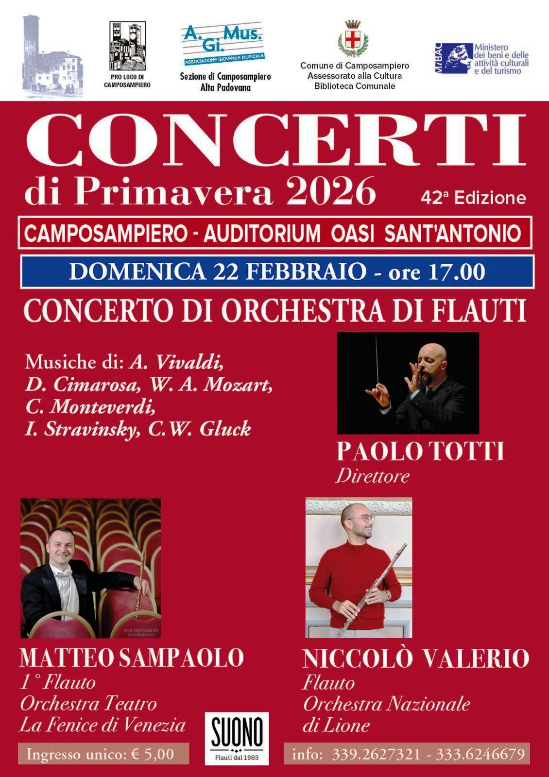 Sarà un prestigioso concerto di Orchestra di Flauti, con il direttore Paolo Totti, al Flauto Matteo Sampaolo, 1°Flauto dell’Orchestra Teatro La Fenice di Venezia e Niccolò Valerio, Flauto dell’Orchestra Nazionale di Lione, a inaugurare domenica 22 febbraio, alle 17:00, presso all’Auditorium dell’Oasi Sant’Antonio la 42a edizione dei Concerti di Primavera.