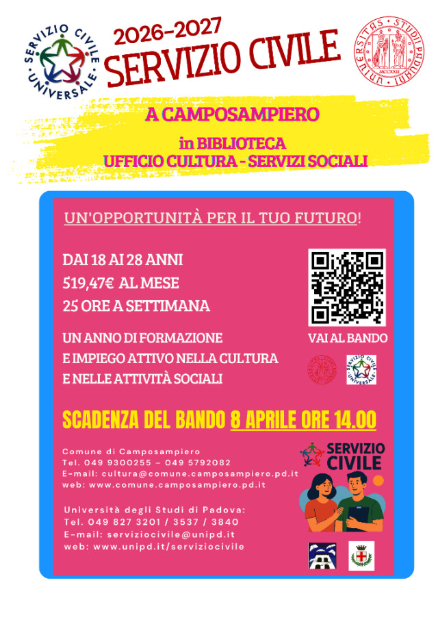 Grazie ad un accordo con l’Università di Padova, è possibile svolgere il Servizio Civile presso il Comune di Camposampiero, in biblioteca - ufficio cultura e all’ufficio sociale.