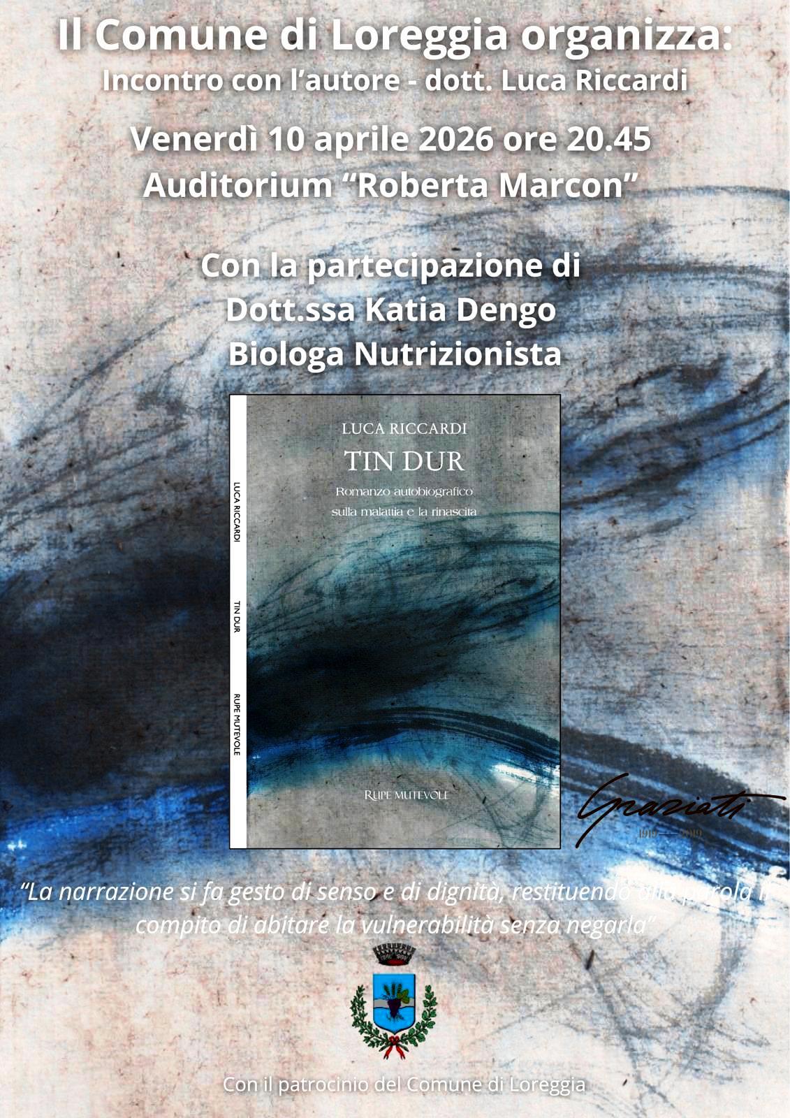 Il Comune di Loreggia venerdì 10 aprile, ore 20:45, presso auditorium Roberta Marcon, organizza la presentazione del libro “Tin Dur “, di Luca Riccardi. Una testimonianza sulla convivenza con la malattia e sulla gestione quotidiana evidenziando la necessità di accettazione.