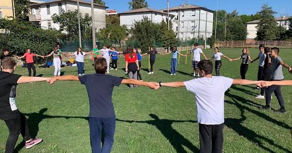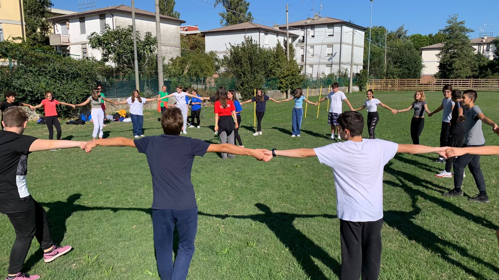 Più di 200 ragazzi e 15 docenti si sono dati appuntamento al campo Marvelli per lo scorso 23 settembre. Il loro obiettivo era conoscersi, divertirsi, integrarsi, capire come funziona la scuola che molti studenti hanno scelto di frequentare. Per tutta la mattinata, i giovanissimi iscritti alle classi prime degli indirizzi tradizionale, sportivo e delle scienze applicate, sono stati accompagnati da 25 studenti tutor delle classi quarte in attività divertenti e utili. Ogni classe si è cimentata con parachute volley, percorsi polivalenti, drum circle, freccette e ragno che raccoglie, acrosport, disegniamoci, il cerchio che scotta e corsa a 3 gambe. Si sono sfidate una contro l’altra non tanto per vincere quanto per avere un’occasione di socializzazione. L’iniziativa infatti è nata con l’obiettivo di creare lo spazio necessario perché gli studenti stiano assieme fuori dalla scuola e “assaporino” cosa significa provare a collaborare tutti insieme per ottenere il risultato migliore possibile, sforzandosi di accettare e integrare le differenze nei momenti di gioco. Questa mattinata ha rappresentato la fase conclusiva delle attività di accoglienza, iniziate nei primissimi giorni di scuola con la conoscenza degli spazi scolastici, del personale e dei propri gruppi classe, con cui sono stati creati dei piccoli slogan che poi sono stati condivisi.