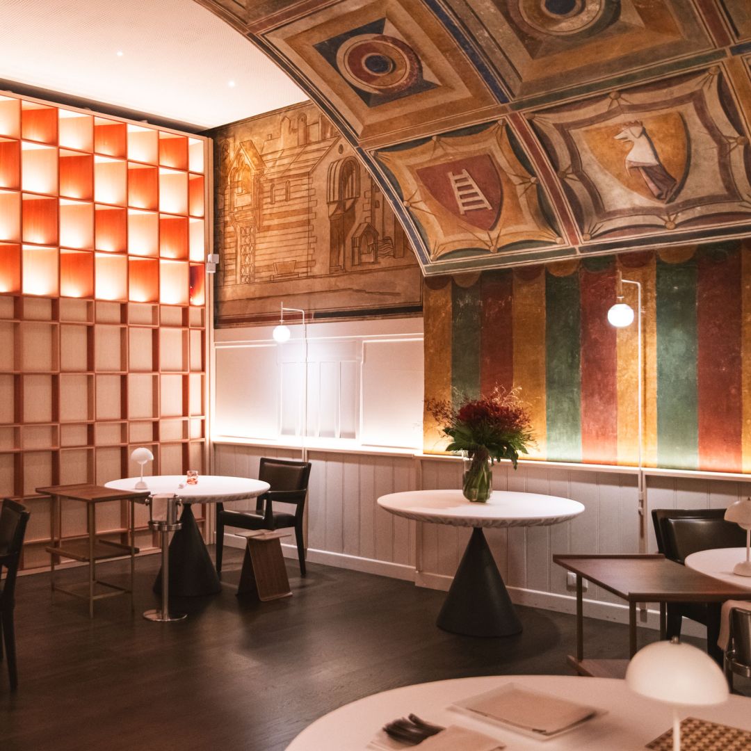 Il ristorante si sviluppa in sale cariche di fascino, con affreschi originali e una vista privilegiata sui resti romani sottostanti.