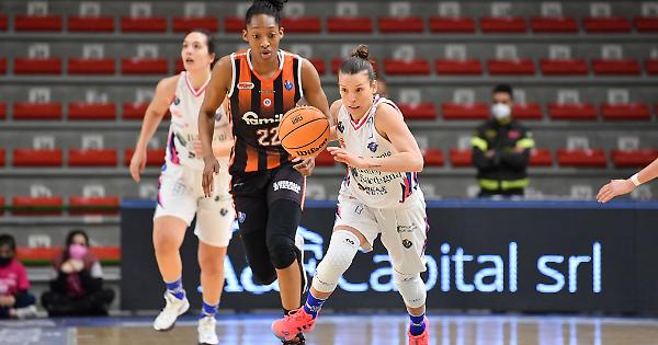 Arriva in Sardegna la ventiduesima vittoria consecutiva del Famila Wuber (il primo posto matematico in Techfind Serie A1 era arrivato già in settimana a Lucca), grazie al successo per 52-87 su Sassari. Una Dinamo piuttosto incerottata, priva di Lucas, Shepard e del neo acquisto Vintsilaiou ha affrontato uno Schio in modalità playoff che ha tenuto altissimi i giri del motore per oltre trenta minuti. Ben cinque le orange in doppia cifra con Andrè che festeggia i 1000 punti in serie A1 e Sottana gli 800 assist. Una bella prestazione delle scledensi davanti al manipolo di tifosi giunti fino in Sardegna per sostenere Sottana e compagne. Approccio solido della Dinamo al match: Orazzo regala due volte il possesso pieno di vantaggio con le triple del 10-6 prima e del 13-10 al sesto. Il Famila risponde con la precisione di Gruda e l’aggressività difensiva che conduce ai contropiedi di Crippa e Laksa. La tripla di Sottana è il punto esclamativo del primo break orange che conduce al 17-24 della prima sirena. Prosegue l’ottimo gioco orange coronato ora dalle triple di una spumeggiante Del Pero che al 13’ sigla il massimo vantaggio sul 19-34. Verona in coast to coast fa +18 mentre Gruda e Skoric mandano le squadre negli spogliatoi sul 32-50. Skoric e Orazzo trovano i primi punti delle isolane al rientro in campo ma arriva poi un maxi parziale orange di 20-7 nel quale, per la Dinamo, segna solo la giovanissima Patanè. Il Famila invece dilaga con Gruda, sempre più top scorer, e Laksa che deposita tre contropiedi consecutivi e pesca poi assieme a Del Pero la conclusione pesante. Anche il finale di quarto vede uno show dall’arco eseguito da Moroni e Sottana: 48-75. L’ultima frazione è l’unica nella quale il livello di gioco cala sensibilmente con numerose conclusioni sbagliate da una parte e dall’altra. C’è il tempo per Gaye di arrivare in doppia cifra.