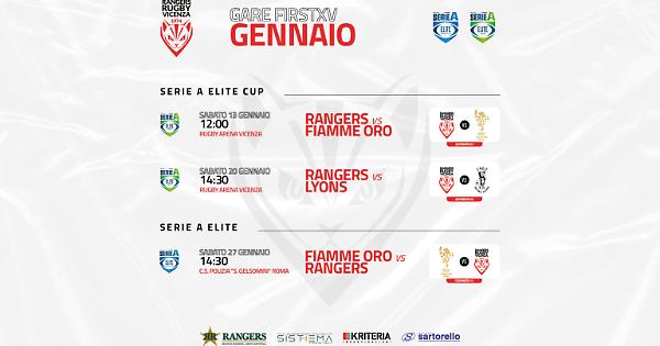 Nel weekend del 6 e 7 gennaio è ripartita la serie A Elite con la decima giornata dove la Rangers osservava il suo secondo ed ultimo turno di riposo. I biancorossi torneranno in campo nei due sabati successivi per le prime due giornate della Serie A Elite Cup, entrambe in casa alla Rugby Arena con Fiamme Oro e Lyons Rugby. A fine mese poi la ripartenza del campionato per i vicentini con la trasferta a Roma con le Fiamme Oro, undicesima giornata della Serie A Elite. Serie A Elite Cup Giornata 1 Sabato 13 gennaio – ore 12:00 – Rugby Arena Vicenza Rangers Vicenza v Fiamme Oro Giornata 2 Sabato 20 gennaio – ore 14:30 – Rugby Arena Vicenza Rangers Vicenza v Lyons Rugby Serie A Elite Giornata 11 Sabato 27 gennaio – ore 14:30 – C.S. Polizia “S. Gelsomini” Roma Fiamme Oro v Rangers VicenzaEdizione