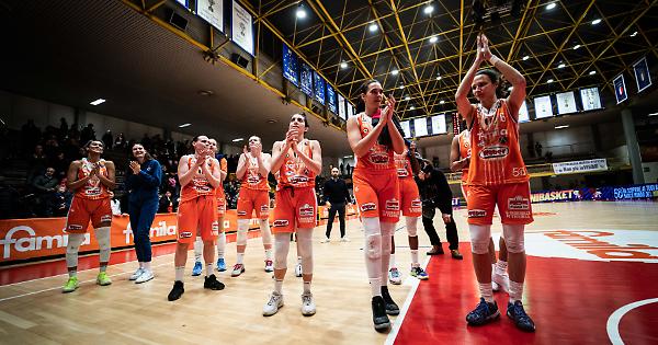Nella diciassettesima giornata di serie A1, il Famila Wuber in emergenza supera 76-62 una combattiva Dinamo Sassari. Al PalaRomare Schio si presenta senza Juhasz (ko per un virus) e con metà squadra che sta recuperando dall’influenza che l’ha colpita a Valencia. Con tutte queste difficoltà le orange giocano un primo tempo sottotono, sempre a rincorrere le avversarie adattandosi al loro gioco veloce e non troppo organizzato. Poi nella ripresa ripartono con una difesa solida e una maggiore incisività offensiva con varie giocatrici a guidare l’assalto al ferro: Verona, Crippa ed infine Sottana. Nella pausa lunga tra primo e secondo tempo momento toccante con il Famila Fans Club, supportato dalla società del patron Cestaro, che ha devoluto un assegno all’AIL Ancora e Macerata, Associazione Italiana contro le leucemie e linfomi in memoria di Gioia Odelanti, la giovane tifosa orange scomparsa pochi mesi fa proprio per questa brutta malattia. Famila Wuber Schio – Banco di Sardegna Dinamo Sassari 76-62 (14-17, 27-33, 48-45) Famila Wuber Schio: Juhasz ne, Bestagno 4, Sottana 9, Verona 14, Guirantes 14, Crippa 10, Parks 5, Keys 4, Penna 5, Reisingerova 11 Banco di Sardegna Dinamo Sassari: Raca 9, Carangelo 12, Toffolo 0, Crudo 0, Kaczmarczyk 10, Hollingshed 10, Joens 19, Spiga ne, Zoncu ne, Togliani 2Edizione