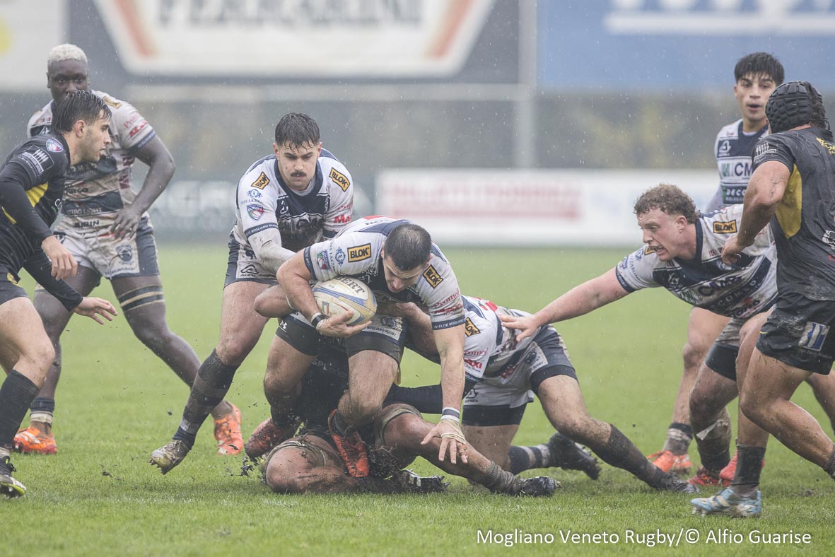 Il match, disputato sotto una pioggia incessante che ha reso il campo pesante e le condizioni di gioco difficili, è stato caratterizzato da un inizio promettente per Mogliano, che però non è riuscito a concretizzare le proprie opportunità. Al contrario, il Rugby Viadana 1970 ha sfruttato ogni occasione, trovando la meta al primo vero affondo. L’onda di entusiasmo che ha travolto la squadra di casa è stata talmente forte che Viadana è riuscita a segnare altre due mete, portandosi sul 21-0. Solo a questo punto Mogliano ha reagito con orgoglio, trovando finalmente il varco nella difesa avversaria grazie a un’incredibile azione di Nelson Casartelli, che ha fissato il parziale sul 21-5 prima dell’intervallo.