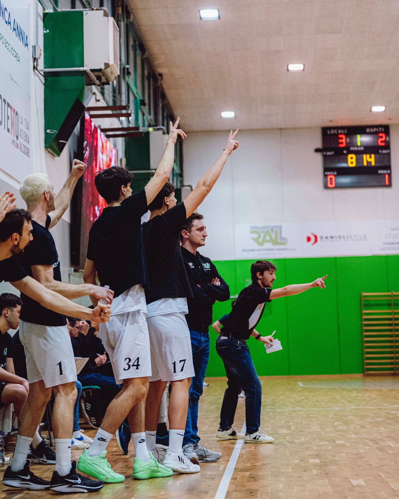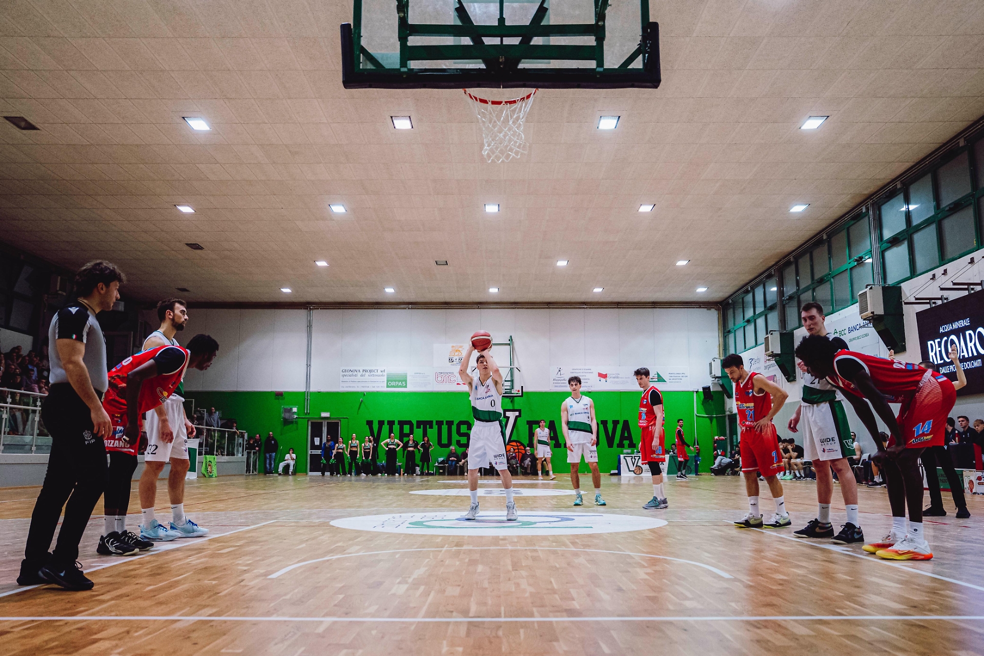 Davanti a un PalaRubano caldo e partecipe, i neroverdi giocano un primo tempo di grande qualità: ritmo alto, circolazione di palla efficace e percentuali eccellenti dall’arco (10/18 nei primi 20’). Il vantaggio prende forma già nel primo quarto, chiuso sul 27-15 grazie alle triple di Bianconi e Trentini e a un attacco fluido e ben orchestrato.