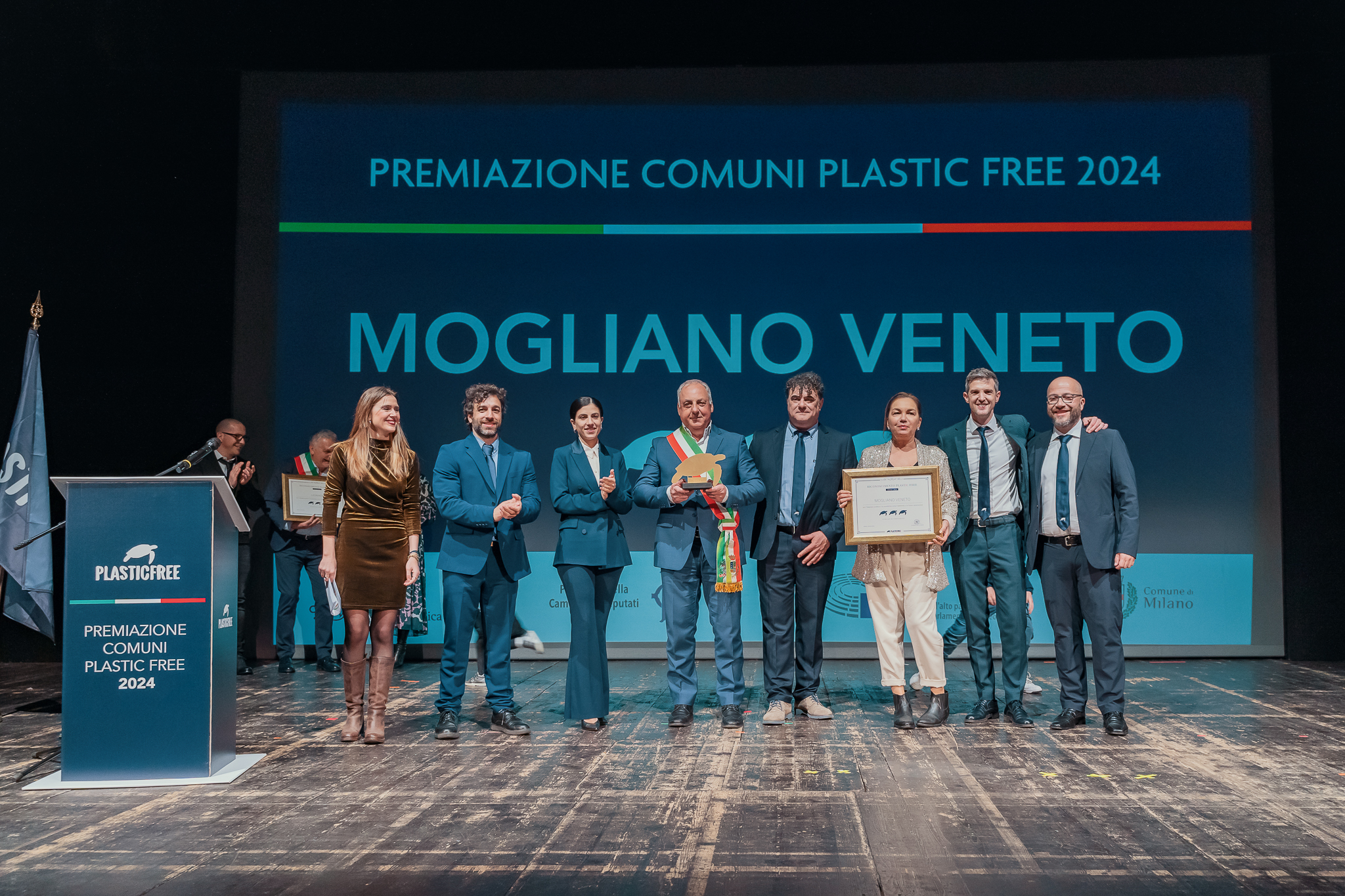 Roberto Zanardo con delega al Decoro Urbano ha partecipato alla cerimonia nazionale ufficiale di premiazione dei “Comuni Plastic Free 2024” ed ha ritirato il riconoscimento a nome dell’Amministrazione Comunale. Ad accompagnarlo nel capoluogo lombardo, Annalia Sembiante, referente comunale Plastic Free. Delle ben 111 Amministrazioni italiane premiate in questa terza edizione (numero in crescita rispetto alle 49 di due anni fa e alle 69 dello scorso anno), Mogliano Veneto rientra tra le 7 – insieme a Ferrara, Borgo Virgilio (MN), Legnago (VR), Tortora (CS), Termoli (CB) e Bacoli (NA) – che hanno ricevuto il massimo riconoscimento di “tre tartarughe” e si riconferma l’unico Comune dell’intera provincia di Treviso. Le Amministrazioni italiane hanno superato la valutazione del Comitato interno, basata su ben 23 punti suddivisi su 5 pilastri: lotta contro gli abbandoni illeciti, sensibilizzazione sul territorio, gestione dei rifiuti urbani, attività virtuose promosse dall’ente e collaborazione con i referenti/volontari locali PlasticFree. A Mogliano Veneto numerose sono infatti le azioni virtuose messe in atto sul territorio per diffondere una maggiore cultura e sensibilità ecologica. Tra le più importanti, le giornate di Educazione ambientale promosse nelle scuole e ai centri estivi, la distribuzione di borracce in alluminio a tutti i dipendenti comunali e agli studenti delle primarie e delle secondarie di primo grado, l’organizzazione di giornate di raccolta di rifiuti abbandonati in collaborazione con le Associazioni di Quartiere, l’ordinanza che vieta il rilascio in cielo di palloncini di plastica e di lanterne volanti, l’attivazione di sistemi di sorveglianza e di contrasto all’abbandono di rifiuti mediante l’uso di fototrappole e l’adozione di misure volte alla riduzione di plastica monouso nella sede degli uffici municipali, oltre al recente inasprimento delle sanzioni per chi abbandona i rifiuti. «L’impegno del Comune di Mogliano è continuo anche nel rapporto con la Provincia di Treviso, che appoggia e condivide il percorso virtuoso. Tra le altre cose, recentemente la Provincia, di concerto con il nostro Comune, ha installato quattro nuovi raccoglitori per i rifiuti sulle piazzole di sosta delle strade provinciali.» ha dichiarato il Consigliere Comunale con delega al Decoro Urbano Roberto Zanardo. «La riconferma delle tre tartarughe, massimo livello di virtuosità raggiunto da soli sette Comuni d’Italia, rappresenta un grandissimo risultato per la nostra Città; è il riconoscimento al nostro quotidiano impegno nell’abbattere l’utilizzo della plastica e nella salvaguardia del nostro amato ambiente. A marzo 2021 la Onlus Plastic Free ci certificava come primo Comune del Nord Italia e quarto di tutto il Paese a ricevere la bandiera Plastic Free. A poco più di un anno di distanza, a giugno 2022, siamo stati premiati in qualità di Comune virtuoso, unico nella provincia di Treviso. Poi un anno fa abbiamo ricevuto il massimo attestato di virtuosità, contro le due ricevute a Firenze l’anno prima. Per la nostra Amministrazione e per tutta la Città di Mogliano, questo riconoscimento è motivo di grandissimo orgoglio. Il mio ringraziamento va ad Annalia Sembiante e a tutti i volontari Plastic Free che periodicamente eseguono le raccolte sul territorio.» ha commentato con grande soddisfazione il Sindaco Davide Bortolato.Edizione