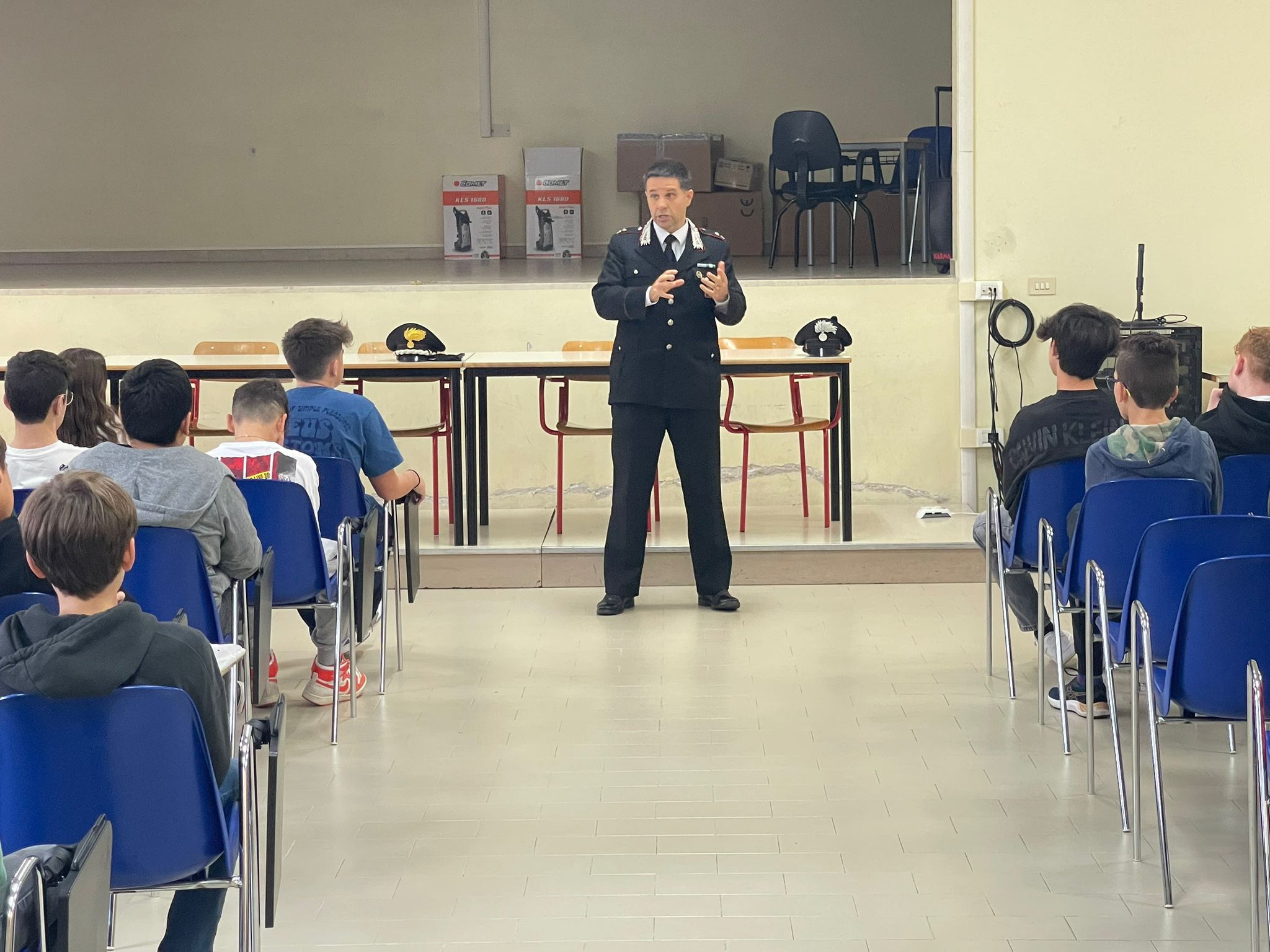 Nella mattinata di oggi, presso la scuola media "Giorgione" di Castelfranco Veneto, il Comandante della locale Compagnia Carabinieri, Maggiore Enrico Zampolli, ha incontrato gli alunni e gli insegnanti delle 7 classi terze dell'istituto. Con gli oltre 130 studenti presenti, molto attenti agli argomenti proposti, sono state trattate tematiche di attuale interesse giovanile, quali bullismo e cyberbullismo. L'Ufficiale dell'Arma ha evidenziato sia le conseguenze di legge che sovente vengono sottovalutate dai giovanissimi responsabili di atti vessatori ai danni di coetanei, sia i risvolti negativi sul piano psicologico provocati alle vittime di condotte prevaricatorie e moleste. Nel corso dell'intervento, infatti, sono stati citati numerosi casi affrontati recentemente dai Carabinieri nell'area della Castellana, mentre i ragazzi sono stati invitati a rappresentare i propri disagi, nella consapevolezza di cercare assieme le soluzioni ai loro problemi. L'iniziativa si colloca nell'ambito della diffusione della cultura della legalità da parte dell'Arma dei Carabinieri, già realizzata nelle scuole e che proseguirà, anche nei prossimi mesi, in altri istituti scolastici.