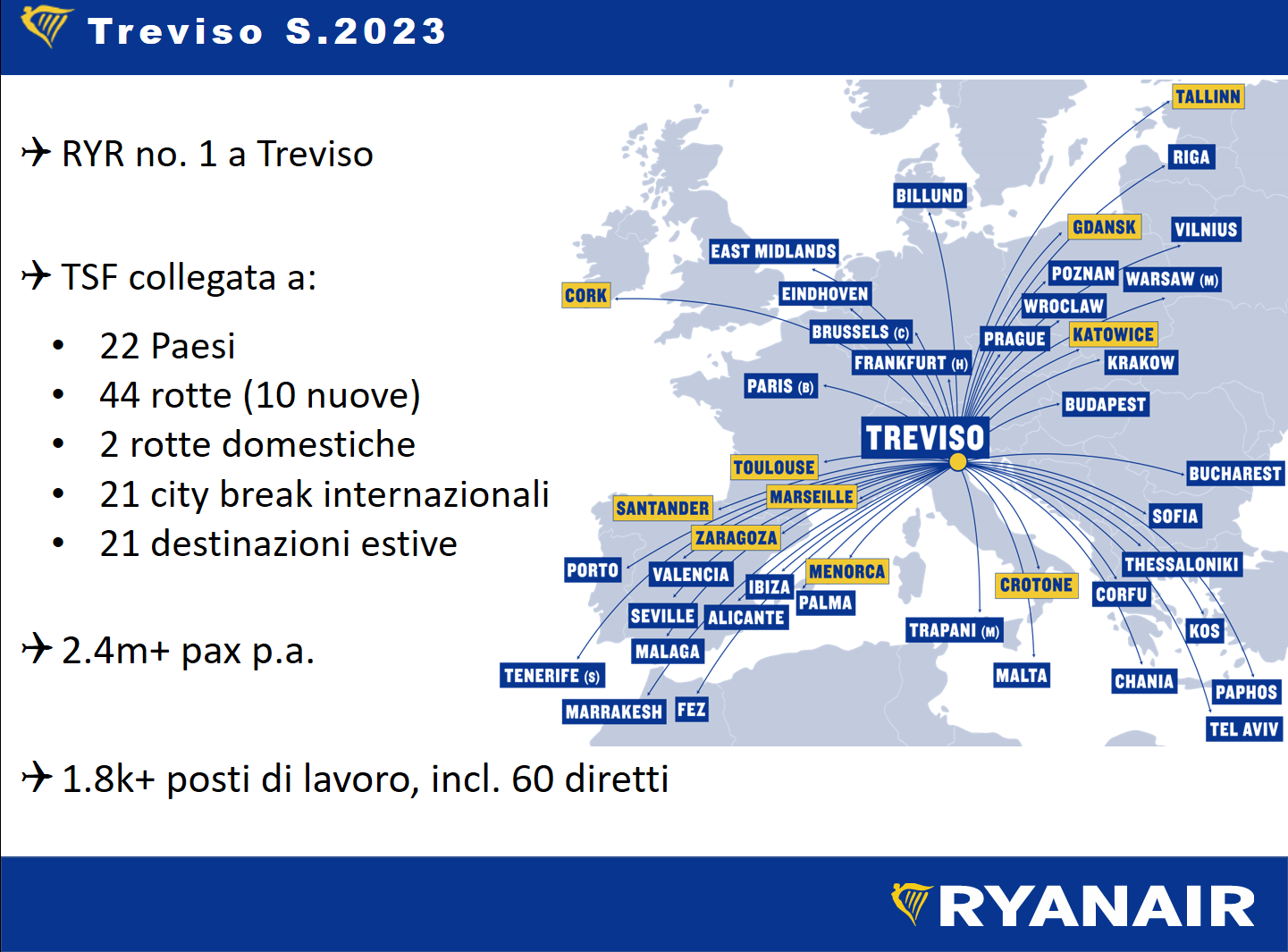 Per l’estate 2023 dall'aeroporto Canova di Treviso partiranno oltre 310 voli settimanali Rynair verso 44 destinazioni, di cui 10 nuove. L'annuncio in occasione della presentazione della nuova campagna di promozione del territorio insieme al Comune di Treviso e al Consorzio di Tutela del Prosecco DOC. Al centro un nuovo claim, Treviso “Land of Prosecco”, per porre il focus su un turismo esperienziale che vuole anche promuovere l’esperienza nelle cantine e nelle tenute della Marca. A breve anche una serie di iniziative ed eventi per il 25esimo anno dal primo volo in Italia, con atterraggio proprio all’aeroporto “Canova” di Treviso. (Continua dopo foto...)