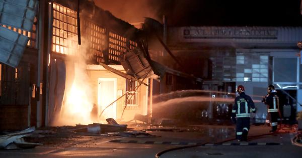 Ancora in corso le operazioni di spegnimento e di bonifica dell'incendio scoppiato all'interno del capannone