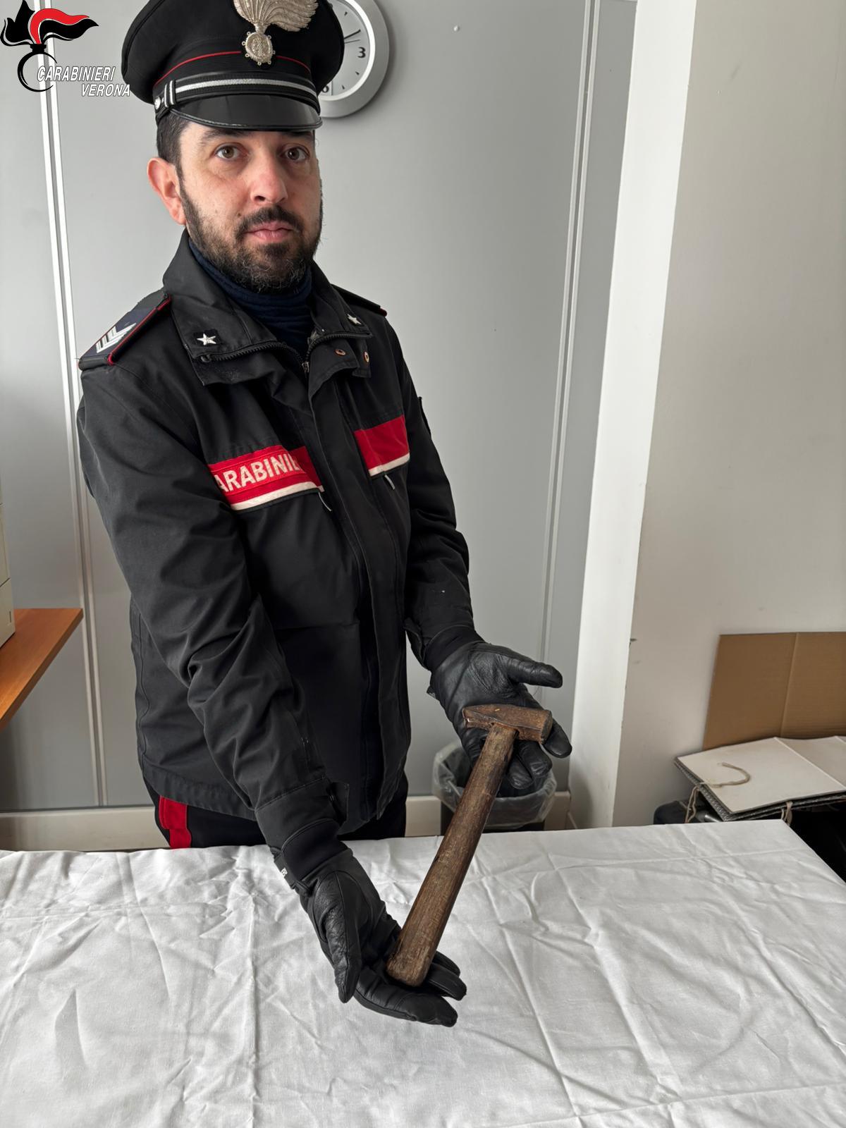 Qui sotto il martello sequestrato dai Carabinieri sul pianerottolo, teatro dell'aggressione e un video gentilmente concesso dall'Arma dei Carabinieri del Comando provinciale di Verona.