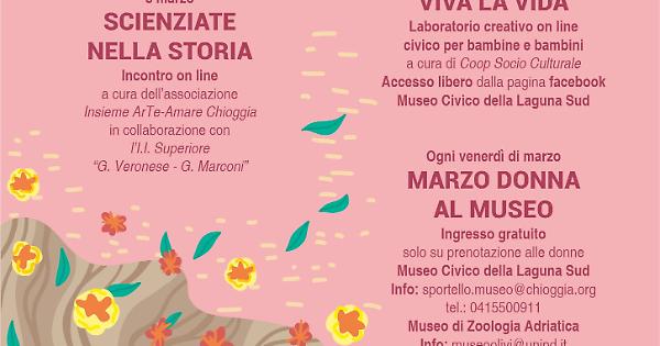 MARZO DONNA AL MUSEO Ingresso gratuito, alle donne, solo su prenotazione Museo civico della Laguna Sud Info: sportello.museo@chioggia.org tel. : 0415500911 Museo di Zoologia Adriatica Info: museoolivi@unipd.it tel.: 041401774