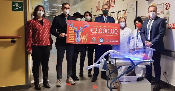 La strumentazione, del valore complessivo di circa 8mila euro, è stata acquistata per l'Ospedale di Mestre dall'associazione "Una carezza per crescere", da tempo impegnata a fianco della Pediatria e della Patologia Neonatale, in particolare sulle tematiche della prematurità; i frutti dell'iniziativa "Renne in mostra" al centro commerciale "Porte di Mestre" hanno contribuito alla donazione. "Consegnamo oggi idealmente la somma di 2mila euro - ha sottolineato il direttore del Centro Commerciale Antonio Impedovo - che è il frutto dell'idea natalizia realizzata con 'SOS Animazione'. Per primi siamo sorpresi per la vasta adesione che ha ottenuto, poiché sono stati una quarantina i plessi scolastici dell'hinterland che hanno aderito: ogni scuola ha decorato una renna gigante, ed oggi le possiamo tutte ammirare vicino all'Albero di Natale all'interno del Centro. Ben 4mila fustelle sono state restituite dai bambini coinvolti, perché fossero appese agli alberi di cartone. Per ogni fustella i bambini hanno idealmente donato 50 centesimi, ora siamo qui con il nostro assegno di 2mila euro".