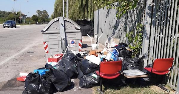 Il cumulo di oggetti da discarica lasciati a fianco di un cassonetto in viale Cricoli: indagini e multa inevitabili