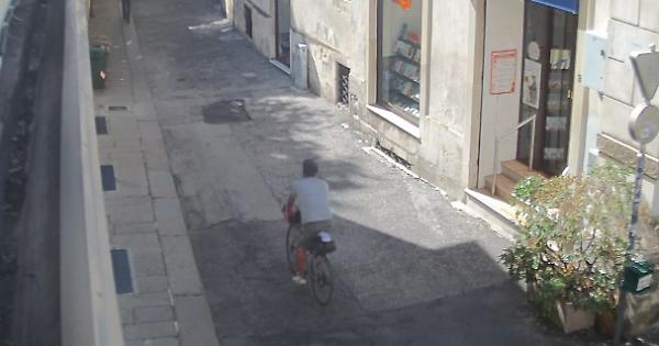 Il ladro ripreso dalle telecamere della polizia locale mentre fugge in sella alla bici rubata