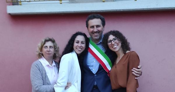 Dario Tovo riconfermato sindaco di Brogliano raggiante e in posa con i familiari dopo la vittoria