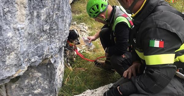 Bruna, un setter inglese, si era allontanata ieri dal suo proprietario, un cacciatore del posto, inseguendo un camoscio ed era finita su un terrazzino in una scarpata, dove non era stata più in grado di spostarsi. Questa mattina un vigile del fuoco si era calato per una trentina di metri dall'alto, ma la bestiola spaventatissima non si era mossa.