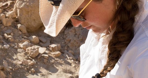 Sara Zaia nel deserto mentre usa la scopetta per pulire un ritrovamento