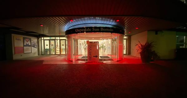 Ingresso del San Bortolo illuminato di rosso per richiamare l'attenzione sul tema