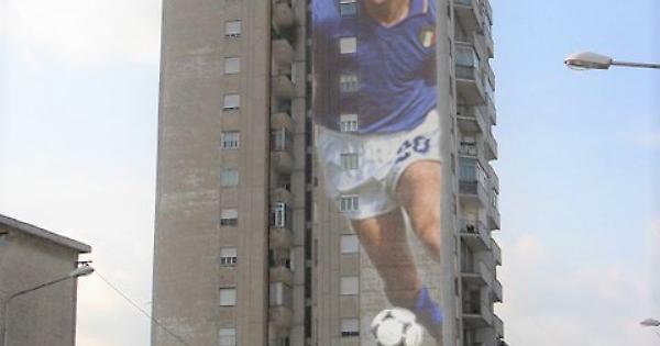 Un'immagine di fantasia, elaborata da "Il Vicenza" sull'effetto di un maxi ritratto di Pablito sul condominio Everest