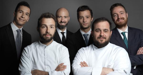 La nuova formazione della Stube gourmet: a destra in primo piano Fabio Falsetti, a sinistra il suo secondo Andrew Lunardi. Alle loro spalle sulla sinistra Jgor Tessari, direttore di sala e a lato sempre a sinistra Achref Werfelli, il sommelier