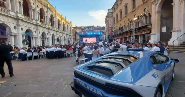 Un'immagine della cena in piazza dei Signori: in primo piano una Lamborghini della Polizia di Stato
