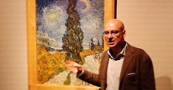 Un'immagine di Marco Goldin accanto a un dipinto di Van Gogh