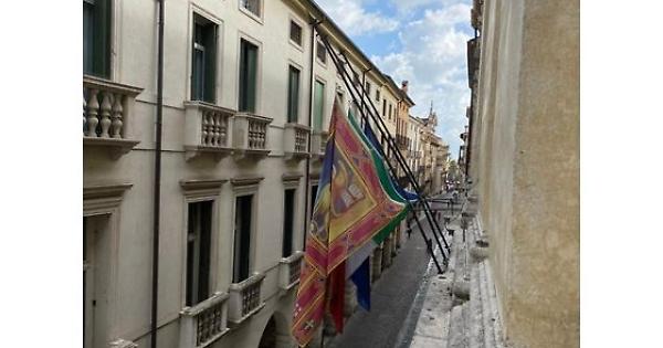 La bandiera a mezz'asta a palazzo Trissino per la regina Elisabetta