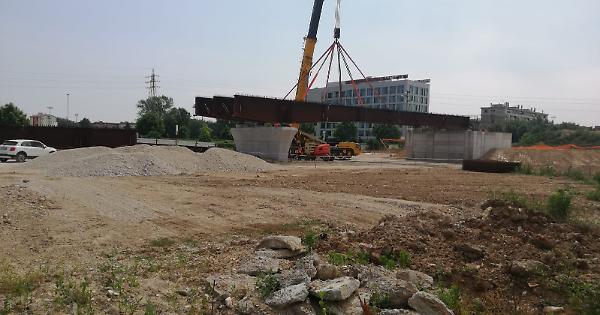 La posa delle prime due travi del viadotto del Sole che fa parte della "bretella dell'Albera"