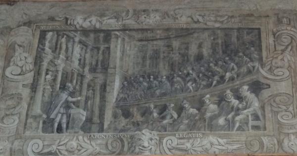 L'affresco nell'anti odeo dell'Olimpico che ricorda la visita degli ambasciatori giapponesi a Vicenza