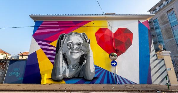 La figura della bambina, creata da Alessio-B con la tecnica degli stencil, con il gesto del cannocchiale invita a guardare oltre, promuovendo uno sguardo profondo e consapevole verso il futuro e la prevenzione.