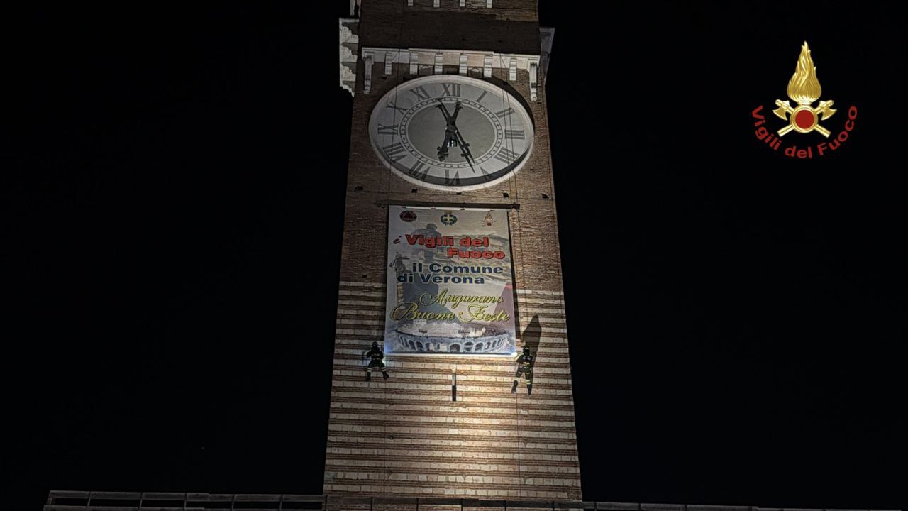 Le squadre dei Vigili del Fuoco hanno poi deposto una corona floreale ai piedi della Madonnina e, con le tecniche SAF (Speleo Alpino Fluviale), hanno srotolato uno striscione di auguri dalla Torre dei Lamberti, regalando un suggestivo spettacolo visivo alla città. Ad accompagnare la celebrazione, la Banda di Grezzana ha eseguito brani mariani e musiche natalizie, arricchendo l’atmosfera di festa e devozione.