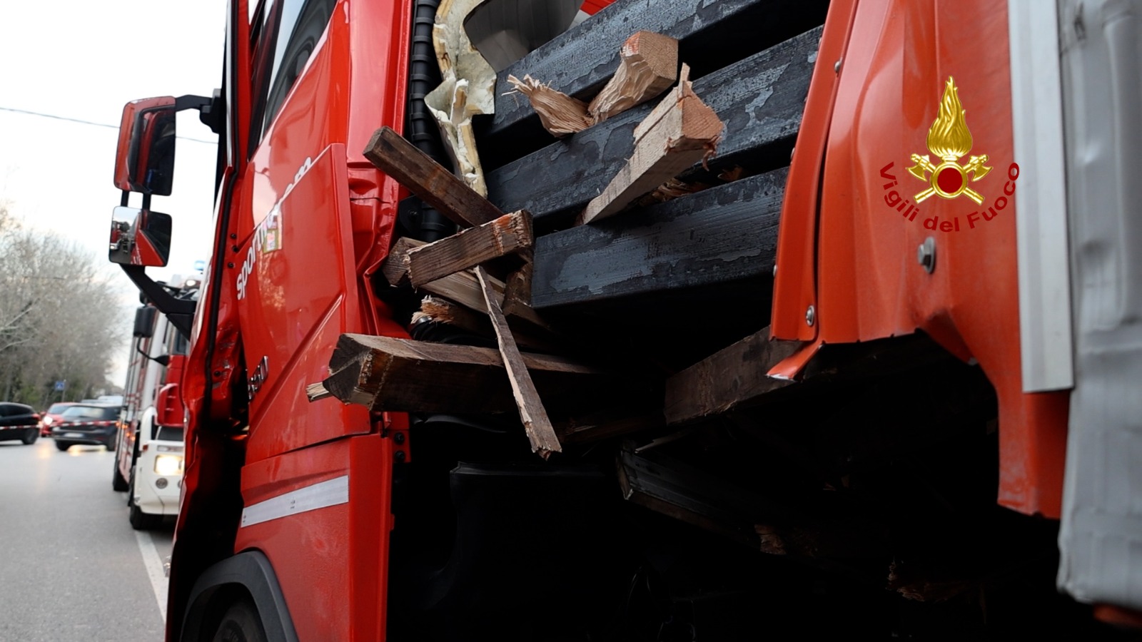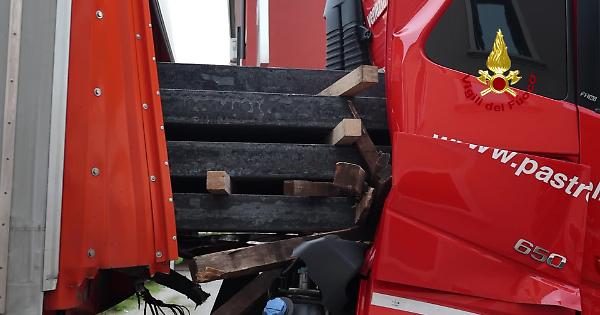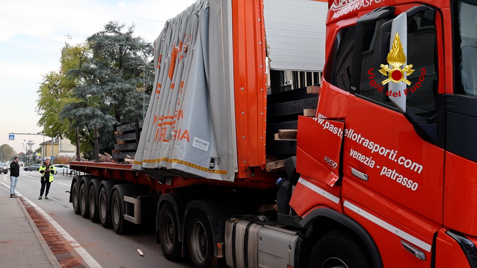 Secondo quanto riportato dallo stesso conducente, l'incidente è avvenuto mentre stava viaggiando verso Vicenza: il camionista ha dovuto frenare bruscamente per evitare un'auto che stava svoltando su una via privata. Il carico, composto da billette di acciaio, si è spostato in avanti, danneggiando la cabina del camion.