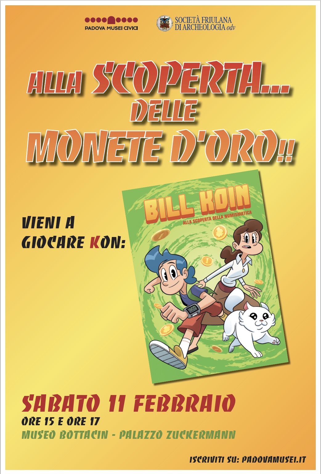 Sabato 11 febbraio il Museo Bottacin, a Palazzo Zuckermann, invita i ragazzi fra gli 8 e i 14 anni alla caccia al tesoro organizzata e promossa in occasione presentazione del fumetto. L' evento, a ingresso gratuito con prenotazione obbligatoria, vedrà i giovani partecipanti seguire le tracce di Bill Koin alla scoperta del prezioso mondo numismatico custodito in Palazzo Zuckermann. Per dare la possibilità a più bambini di partecipare, il Museo Bottacin propone due turni di gioco, alle 15.00 e alle 17.00 ed è prevista la presenza di un solo accompagnatore per ciascun minore per lasciare spazio ai ragazzi e alle ragazze; gli adulti saranno invitati a visitare la collezione Bottacin accompagnati dalla dott.ssa Valeria Vettorato, conservatore del Museo.