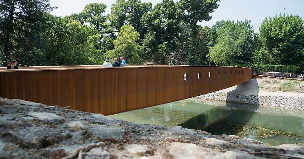 La nuova passerella, che sostituisce la precedente, attraversa il corso d'acqua con una singola campata di 48 metri di lunghezza e oltre 4 metri di larghezza. Realizzata in acciaio autoprotetto Corten e rifinita internamente con legno lamellare e acciaio inox, particolare attenzione è stata data al dialogo visivo con il paesaggio: le balaustre laterali, che servono anche da parapetti, sono dotate di oblò panoramici di grandi dimensioni che permettono di ammirare il fiume e l’ambiente circostante.